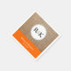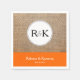 This simple and modern wedding napkin features a white circle with the monogram of the bride and groom on a photo of burlap background. Customisable text, on an orange background near the bottom, features the names of the bride and groom and their wedding date.