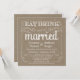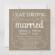 Eat, Drink, and be Married -- Vintage style rustic country wedding invitations -- Swirly, curly scrolls and old-fashion typography on khaki tan burlap background. Add your names and wedding info in this easy to use template. Elegant but fun and whimsical, chalkboard style script writing can be modified for your formal or semi-formal retro wedding theme. Casual modern style is perfect for trendy contemporary weddings with a fun touch of sophisticated charm for traditional couples. Please contact us for help with customisation if you need additional room for your wedding details. Other sizes and chalkboard styles available, along with coordinating styles for engagement party and couples shower. NOTE: This product design is set-up for square cards only -- requires extra postage.