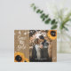 Rustic floral save the date photo postcards featuring sunflowers and string lights on a burlap background. Ideal card design for a rustic-themed wedding party inspired by sunflowers.