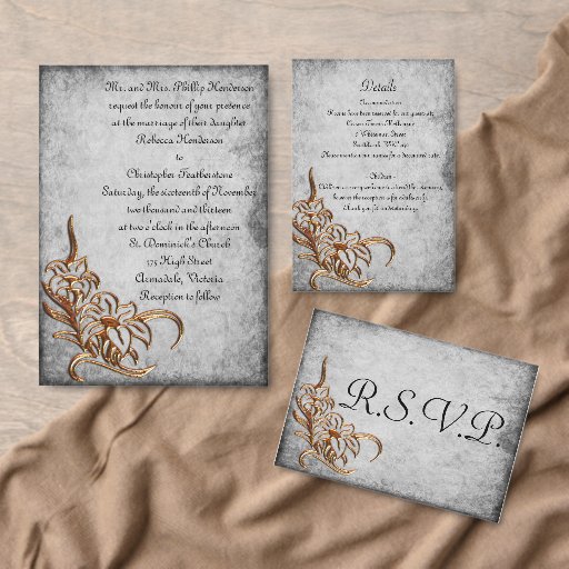 This vintage, grey antique parchment wedding envelope with metallic gold flowers features a charming, rustic old-world look. There is also a larger gold metal flower on the inside of the envelope. This elegant wedding envelope is part of a larger collection of matching wedding stationery including invitations, wedding details card and more which you can check out in the collection below.