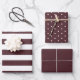 This set of wrapping paper sheets features a solid burnt burgundy coloured sheet with coordinating sheets of wide burnt burgundy stripes on white, and white polka dots on burnt burgundy.