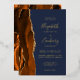The left-hand edge of this elegant modern wedding invitation features a burnt orange watercolor agate border trimmed with faux gold glitter. The customisable text combines real gold foil handwriting, copperplate and italic fonts on a dark navy blue background. The reverse side features a matching burnt orange and gold agate design.