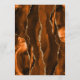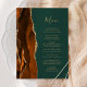 The left-hand edge of this elegant modern wedding menu features a watercolor agate border in shades of rust and burnt orange, trimmed with faux gold glitter. The customizable text combines gold-colored handwriting script and copperplate fonts on a dark green background. The reverse side features a matching rust and gold agate design.