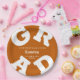 GRAD in bold white lettering curves around the edges of these burnt orange graduation party paper plates - available in 2 sizes. Congratulations above the name of your graduate and the Class of below. The perfect addition to your table decor for upcoming grad parties. **TIP: Click on CUSTOMIZE button; click on COLOR box on top right; enter your colour hex code in the #xxxxxx box to match your school colours. SEE ENTIRE COLLECTION of pre-done colour combinations and more in our store.