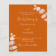 Burnt orange background, decorated with eucalyptus stems, sprigs. Personalize and and add your names and the details.