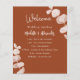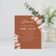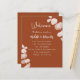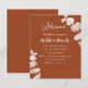 Dark burnt orange background, decorated with eucalyptus stems, sprigs. Personalise and add your names and the details.