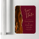 This elegant modern save the date magnet features a burnt orange watercolor agate border trimmed with faux gold glitter. Easily customise the gold-coloured text on a burgundy background.