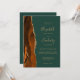 The left-hand edge of this elegant modern wedding invitation features a burnt orange watercolor agate border trimmed with faux gold glitter. The customisable text combines gold-coloured handwriting, copperplate and italic fonts on a dark green background. The reverse side provides space for wedding details on a solid dark green background, along with a QR code guests can scan to visit your website and RSVP, which saves the cost of printing and mailing separate RSVP cards.
