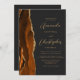 The left-hand edge of this elegant modern wedding invitation features a burnt orange watercolor agate border trimmed with faux gold glitter. The customisable text combines gold-coloured script and sans serif fonts on a slate black background. The reverse side provides space for wedding details on a solid slate black background, along with a QR code guests can scan to visit your website and RSVP, which saves the cost of printing and mailing separate RSVP cards.
