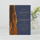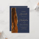 The left-hand edge of this elegant modern wedding invitation features a burnt orange watercolor agate border trimmed with faux gold glitter. The customisable text combines gold-coloured script and sans serif fonts on a navy blue background. The reverse side provides space for wedding details, along with a QR code guests can scan to visit your website and RSVP, which saves the cost of printing and mailing separate RSVP cards.