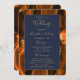 This elegant, modern wedding program features a burnt orange agate background trimmed with gold faux glitter. The text appears in elegant gold coloured handwriting and copperplate fonts on a dark navy blue rectangle.