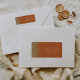 The left-hand edge of this elegant modern wedding return address label features a gold faux glitter design. The customisable text combines pale gold-coloured handwriting, copperplate and italic fonts on a burnt orange background.
