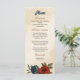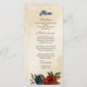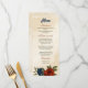 Unique wedding menu card featuring romantic burnt orange and navy blue flowers and green leaves.