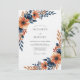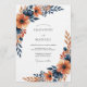 This artistic design features a rich palette of burnt orange blooms accented with deep navy foliage. A painterly watercolor style evokes a sophisticated yet organic mood for a memorable occasion. The arrangement flows gracefully across the canvas.