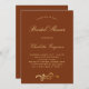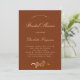 Burnt orange, rust colored background. Personalize and add your names and the details. Golden text. Decorated with a faux gold swirls, sprig.