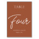 Modern table numbers elevate your wedding reception table décor. The design features an elegant script font in white on a burnt orange earth tone background perfect for a fall wedding or banquet event. Order each table number from the collection or edit this card for each number needed. The design is printed on both sides.