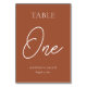 Modern table numbers elevate your wedding reception table décor. The design features an elegant script font in white on a burnt orange earth tone background perfect for a fall wedding or banquet event. Order each table number from the collection or edit this card for each number needed. The design is printed on both sides.