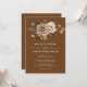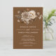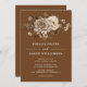 Elegant wedding invitations with boho-style florals in shades of ivory and deep brown on a dark orange background. Simplistic text layout with a pretty floral header. Ideal for a fall wedding.