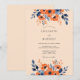 A warm palette of burnt orange and deep navy blue creates a sophisticated atmosphere for a fall event. Delicate watercolor blossoms, resembling poppies and anemones, decorate the top and bottom in a graceful arrangement. Indigo foliage and soft peach accents provide a rich contrast against the warm cream backdrop.