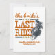 Yee haw!!! It's time to celebrate one last time before this cowgirl gets hitched! It's the bride's last ride before she settles down, also known as a bachelorette or hen party. Design features a cowgirl racing on her horse with distressed western and fat script text and stars. Perfect for a western or country themed event. Shown in burnt orange. Also available in a combination of pinks, state flag blue and red, and maroon. Matching products available.