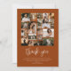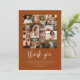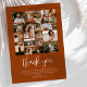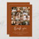 A minimalist terracotta wedding thank you card to send out to family & friends to show your appreciation of them helping you celebrate your wonderful day. Featuring a 17 wedding photo collage, the title "thank you" in a elegant script font, and a personalised thank you note.