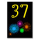 This table card design features a customisable number above a bursting fireworks-like pattern of various colours.
