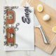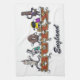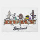 The landmarks of Bury, in Greater Manchester, England, featuring a stylized cartoon character versions of its landmarks and townscape, including (from left to right) the Whitehead Clock Tower, a Transport for Greater Manchester (TfGM) bus stop holding a JD Sports drawstring bag, a traditional Bury black pudding, and a Metrolink tram carrying bags from The World Famous Bury Market and The Rock, and finally, The Peel Monument holding a beret from a Lancashire Fusilier. Bury is spelled out in traditional red brick and sandstone, with cotton flower embellishment.