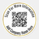 You can enter your url to change the QR code so that it goes to your website. The top line of display text says 'Scan For More Information'. The bottom line of display text is for your company name or a custom message. The faux gold border is not made of foil. The text is black. The sticker is white.