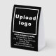 Black tent style paper table sign that you can customize by uploading your business logo, typing your business name, address, phone number, e-mail and website or social media page. Customize and display it on your desk as a marketing material to advertise your business or to promote your brand to customers or clients. Customizable office desk accessory that you can use to build brand name awareness. Please check the appearance after uploading logo and typing texts. If the appearance is pleasing to you, you can place your order now. If you need to resize or reposition the logo and texts, please adjust in the design tool. You can also change the font style, font color and background color in the design tool.