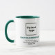 Hunter green combo mug that you can customise to put your business brand to build brand name awareness while your customers enjoy sipping the aromatic and tasty coffee or tea that you served to them in your coffee shop, diner or restaurant business. Mug as promotional product, giveaway item or gift to your customers or clients, a marketing strategy to advertise your business or to promote your brand. To customise this mug, upload your business logo, type your business name, address and phone number. Please check the appearance on front and back sides after uploading logo and typing texts. If the appearance is pleasing to you, you can place your order now. If you need to resize and move the logo and texts to fit on this mug or on the size and style that you will choose, please change in the design tool. You can also change the font colour and font style in the design tool.