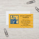 Business card showing illustration of a chimney sweeper cleaner worker with sweep broom viewed from side with chimney stack set inside square done in retro style.