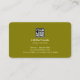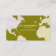 Nice olive green colour contact card to promote yourself with elegance... front side: oversized map of the world, name and profession (tour guide, travel agent...), and custom slogan ('here we go again'); back: lines of text (business name, phone, email and address) with Company logo.
