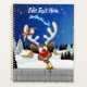 A Funny cartoon reindeer with a bright red nose and large white antlers, adorned with a red and gold bow, peeks through an open window. Outside, a snowy landscape with silhouetted pine trees and a small, glowing house is visible under a dark blue, star-filled night sky. Santa's sleigh pulled by reindeer is flying in the distance. The scene evokes a festive and whimsical Christmas atmosphere. Original Vector Art Copyright BluedarkArt TheChameleonArt.