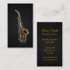 Illustrated business cards for saxophone players or instructors; black and golden music design with illustration of saxophone outline; design is personalised with customisable text fields for adding your name, business, address and other informations