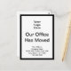 Front: A display image is at the top. You can replace the image with your logo. "Our Office Has Moved" is in the centre. Five lines of black display text for your new address are at the bottom. The front has a black border.