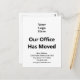 Front: A display image is at the top. You can replace the image with your logo. "Our Office Has Moved" is in the centre. Five lines of black display text for your new address, phone number, and website are at the bottom.