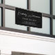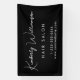 Chic promotional black banner sign for your business with a minimalist vibe featuring your company name or brand in a stylish white signature script and additional text below in simple modern white lettering.