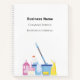 A white, clean background decorated with cleaning equipment in pink, blue and yellow. Personalise and add your name and text.