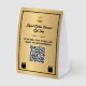 Business Company Scan Qr Code Payment Marketing Table Tent is great to feature your business, logo, QR code and marketing messaging. The table tent can be used for various businesses with your information and logo, The Table Tent Sign is bright, professional and elegant with colors of gold and black that will attract customers to look and engage with scanning the Qr code. The logo at the top is great for brand recognition. The QR code is a clear and is a call-to-action to scan it. There are two Qr codes one on the front and one on the back where you can direct your cutomers to different web or social media pages. Personalize it with your information.