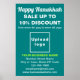 Happy Hanukkah! Wishing you joy, peace and blessing this festival of lights. A holiday to celebrate this December and to advertise also your business. Customisable poster with Hanukkah Sale, your business name and other information. Poster that you can use as marketing material to attract more customers. Customise it and use it to convince more customers to buy your products or clients to like your services this Hanukkah. Design colours are white and yellow-green texts on teal green background. Contents are Happy Hanukkah greeting, sale texts with percent discount that you will offer, sale dates, your business name, logo, address, phone number, e-mail and website or your business social media page. Please check the appearance after uploading logo and typing texts. If the appearance is pleasing to you, you can place your order now. If you need to resize and move the logo and texts to fit on this poster or on the size and shape that you will choose, please change in the design tool. You can also make other changes in the design tool according to the appearance of this poster that you prefer such as changing the background colour, font colour and font style. Happy Hanukkah! Wishing you more sales this holiday.