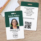 Create a professional appearance with a branded employee ID badge. This editable template can be personalised with your profile photo, name, job title, and company logo. Return details are on the back, along with additional information, and a QR code. Perfect for creating a cohesive branding experience, or simply to verify the identity of the wearer and display their qualifications. This identification badge is ideal for customer-facing roles and corporate settings — from business consultants and retail stores to medical professionals, hospital staff, office workers, conference teams, corporate events and more. Custom badges build brand identity and enhance security. Printed colours: very dark green, grey and white. Vertical format.