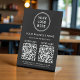 Modern and professional all-purpose black table top pedestal sign for your business. Upload your logo and 2 QR codes for customers to scan for payment, information, a list of your products, services, prices, etc. Label the QR codes and add your business name, phone number, street address, website or other information in simple white typography.