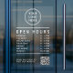 Present your business hours clearly and professionally with this modern Open Hours clear window cling. Designed with a clean layout, your logo and QR code, and easy-to-read white lettering, this sign helps customers instantly see when you’re open -- while reinforcing your brand at the storefront. Ideal for retail stores, salons, cafés, restaurants, studios, clinics, and service-based businesses. The QR code is automatically generated by Zazzle from the website address you provide, ensuring a seamless setup with no technical steps required. With one quick scan, customers can visit your website for updates, services, menus, appointments, or additional business information. Easy to apply and remove, this professional window decal is perfect for glass doors and windows.