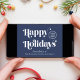 Business corporate Christmas card for customers, employees, affiliates, etc., with "Happy Holidays" written in stylish white serif typography against a blue background. Add your logo and seasonal greeting (thank you, from all of us, etc.) and company name. On the back, input your website address to create a scannable QR code.