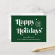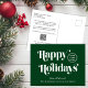 Green corporate Christmas postcard for your customers, employees, affiliates, etc., featuring "Happy Holidays" in stylish white typography, your company logo and your business name in simple modern white typography. On the back, add a personalised seasonal message of appreciation and thanks and input your website address to create a QR code that customers can scan to connect to your online platforms.