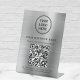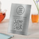 Modern table top pedestal sign for your business with your QR code for customers to scan for a list of your products, services and prices. Add your logo, business name, QR code, phone number and street address in simple typography against a brushed silver faux metallic background.