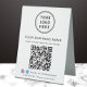 Modern table top tent sign for your business. Upload your logo and a QR code for customers to scan for a list of your products, services, prices or other information. Add your company name, phone number, website address, etc., in simple typography.