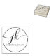 Business Monogram Script Logo Name Rubber Stamp. Elegant business rubber stamp featuring a monogram initials logo in fancy calligraphy script with swashes and your custom text. CHANGES: Change any text font style, colour, size, spacing and placement in EDIT. Choose an ink pad colour, if desired, on the ordering page. ASSISTANCE: For help with design modification or if you would like coordinating items, contact the designer BEFORE ORDERING via the Zazzle Chat MESSAGE tab or email makeitaboutyoustore@gmail.com.