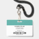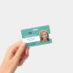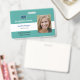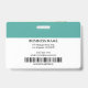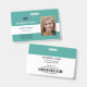 Personalise Business Name badge with Photo, Name, Logo and All Info; plus place for bar scan and numbers on teal and white design.