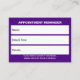 Remind your clients or customers to meet you. Give them the scheduled date and time to meet you. Aside from reminding your customers or clients by giving this appointment card, build brand name awareness, advertise your business or promote your brand name. Appointment card that you can customise to put your business name and with empty spaces to write customer's or client's name, date, time and appointment details or purpose of visit. The colour is purple and font colours are pink and white. To customise this appointment card, upload your business logo, type your business or company name, address, phone number, e-mail and website or social media page. Please check the appearance on front and back sides after uploading logo and typing texts. If the appearance is pleasing to you, you can place your order now. If you need to resize and move the logo and texts to fit on this appointment card or on other shapes, styles and sizes that you will choose, please change in the design tool. You can also make other changes according to the appearance that you prefer in the design tool such as changing the background colour, font colour and font style.